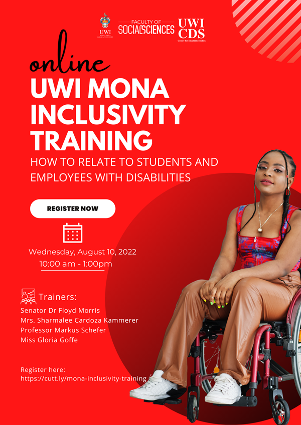 The Centre for Disability Studies in the Faculty of Social Sciences, UWI Mona invites you to the UWI Mona Inclusivity Training: How to relate to Students and Employees with Disabilities on Wednesday, August 10, 2022 from 10:00 am to 1:00 pm.