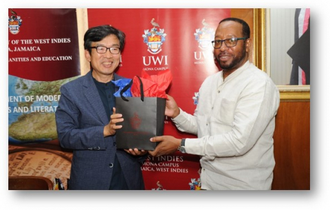 (L-R): Deputy Principal, The UWI, Mona, Professor Ian Boxill (right), presents Ambassador of the Republic of Korea to Jamaica, His Excellency Suh Jeong-in with a gift after he delivered a Public Lecture on May 13, 2022, at the Mona Campus.
